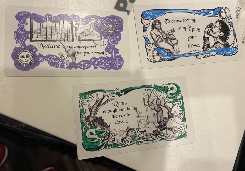 I had the immense privilege of attending the most fun workshop at GenCon 2024, hosted by CSE Cooney and Carlos Hernandez. Their game, Negocios Infernales, was funded through Kickstarter, and we used the spooky cards included in the game to fuel our creativity and create something inspired by the card prompts–song, play, short story, outline, poem, nursery rhyme–anything! I’m not sponsored, but I wanted to share the creativity that came of it!